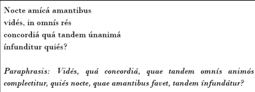 Testo e parafrasi (sempre in latino) di una parte di “L’amore è nell’aria stasera”
