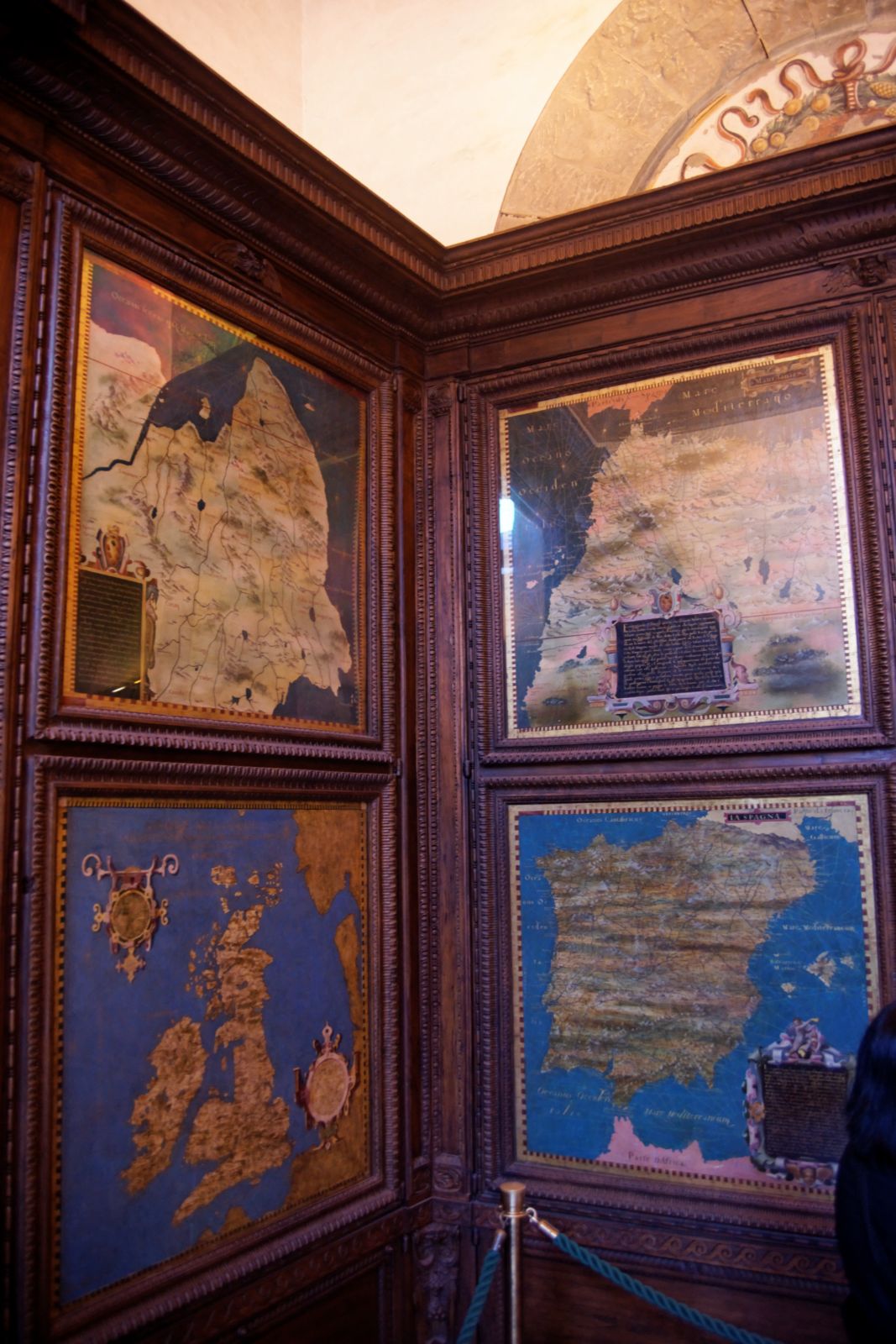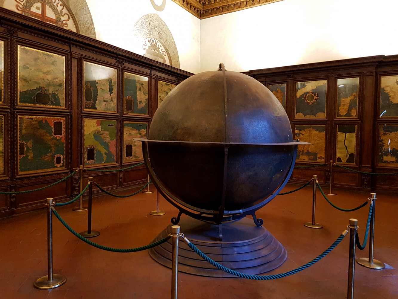 Al terzo piano del Museo di Palazzo Vecchio la “Sala delle Carte Geografiche”, in origine sede della Guardaroba Medicea di Cosimo I (1519-1574) e per questo tecnicamente chiamata “Sala del Guardaroba”, custodiva tutti i beni mobili della corte, che venivano accuratamente depositati all’interno di grandi armadi a muro. Le ante delle armadiature furono abilmente dipinte tra il 1536 e il 1589 da Egnazio Donati e Stefano Buonsignori e destano stupore nei visitatori che abitualmente riempiono la sala. Queste rappresentazioni, dai colori ad olio sgargianti, raffigurano 57 carte geografiche, quattro delle quali, sfortunatamente, sono andate perdute. L’idea iniziale per la decorazione della sala, concepita dal Vasari e poi ceduta al Donati, avrebbe dovuto prevedere anche affreschi dai motivi astronomici sul soffitto e due globi sospesi ad altezze diverse, rappresentanti il globo celeste e il globo terrestre. Il progetto rimase incompiuto e, solo nel 1958, fu trasportato il magnifico mappamondo proveniente dal Museo degli Strumenti Antichi di Firenze. Il famoso globo, che troneggia al centro della sala, misura oltre 2 metri di circonferenza ed è il più antico oggetto di questo tipo che sia mai giunto sino a noi.